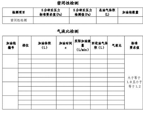 油氣回收設(shè)備的檢測(cè)報(bào)告必須要包括液阻、密閉性、氣液比三項(xiàng)。這三項(xiàng)是檢測(cè)油氣回收設(shè)備的重要內(nèi)容。如果有一點(diǎn)檢測(cè)不合格就需要進(jìn)行處理,油氣回收設(shè)備檢測(cè)合格才可投入使用。那么關(guān)于油氣回收檢測(cè)報(bào)告內(nèi)容具體的可以看看下面的自檢報(bào)告表。